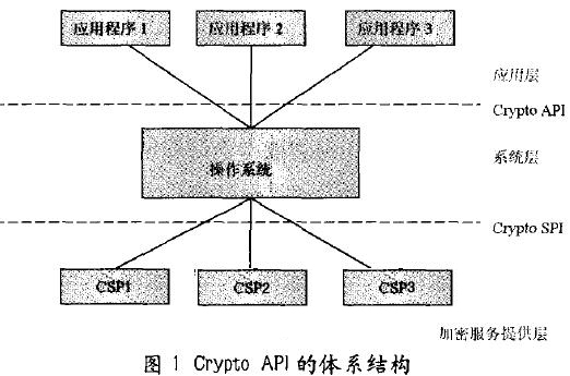 2.1智能卡與PC/SC規(guī)范 智能卡是一張內(nèi)含嵌入式集成電路芯片的信用卡般大小的塑料卡,具有儲存信息量大,數(shù)據(jù)保密性好,抗干擾能力強(qiáng),儲存可靠,讀寫設(shè)備簡單,使用靈活,操作速度快,脫機(jī)工作能力強(qiáng),易于攜帶等特點(diǎn)。本系統(tǒng)所使用的智能卡是一張?zhí)刂频膬?nèi)含有交換密鑰對,簽名密鑰對和證書用以提供加解密、認(rèn)證等服務(wù)的電子卡。 PC/SC規(guī)范是一套為集成電路卡(ICC)與個人計算機(jī)系統(tǒng)設(shè)計進(jìn)行交互的規(guī)范,能夠讓智能卡方便地訪問WindoW平臺。其主要優(yōu)點(diǎn)就是讓應(yīng)用程序不必為了與智能卡通信而去了解智能卡讀卡器的細(xì)節(jié),應(yīng)用程序通過PC/SC規(guī)范和智能卡讀卡器通信,后者再通過ISO7816與智能卡進(jìn)行通信來獲取智能卡提供的服務(wù),其傳輸?shù)陌Y(jié)構(gòu)是TPDU。 1.2 Crypto API體系結(jié)構(gòu)與CSP Crypto API是微軟提供的一套公共接口,包含了一系列的函數(shù),為應(yīng)用程序提供加解密、數(shù)字簽名、哈希等安全服務(wù),而應(yīng)用程序不必關(guān)心其具體實現(xiàn)。不同的供應(yīng)商可以開發(fā)獨(dú)立的加密模塊,這些模塊成為加密服務(wù)提供者(Cryptographic Service Provider CSP),完成密鑰生成/交換、加解密、數(shù)字簽名、認(rèn)證等服務(wù)的真正模塊。微軟默認(rèn)的CSP是RSA Based Provider,使用RSA公司的加密算法。一個系統(tǒng)中可以加載多個CSP模塊,它們相互獨(dú)立。應(yīng)用程序可以使用任意一個CSP模塊,而不必關(guān)心它的具體實現(xiàn),每個CSP都對Crypto API進(jìn)行不同的實現(xiàn)。 Crypto API的體系結(jié)構(gòu)如圖1所示。